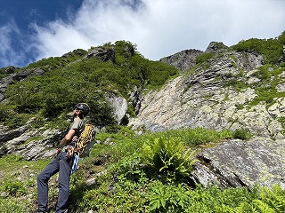 Bガリーの登りは中央付近のクラック沿いから。難しくはなさそうだが、支点が無いので万が一落下すると谷底まで落ちていくリスクがある。空荷で登り荷物はロープで引き上げるほうが良いかも。