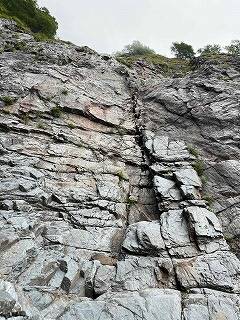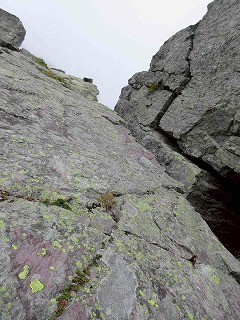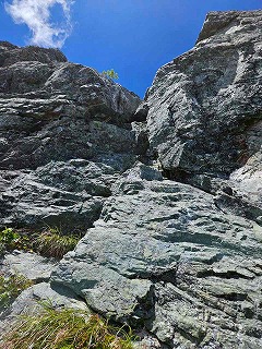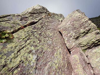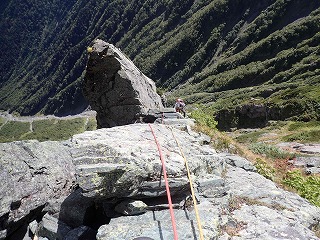 トラバースの手がかりは良く、よく見ると足の置き場もあるが、下が丸見えの切れ落ちた岩のところを通過するのは高度感が半端なかった。