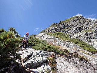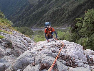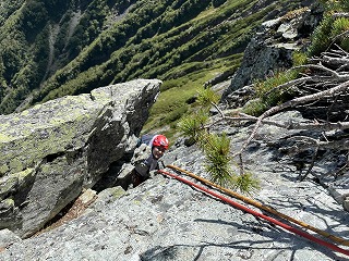 ロープが屈曲するので流れを意識して、岩のピナクルでピッチを切る。