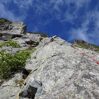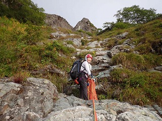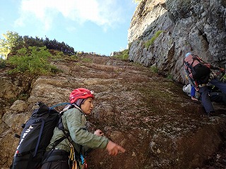 傾斜は緩く、先行パーティはロープを出さなかったが、出だしが濡れていたので、私たちは安全のためにここでもロープを出した。